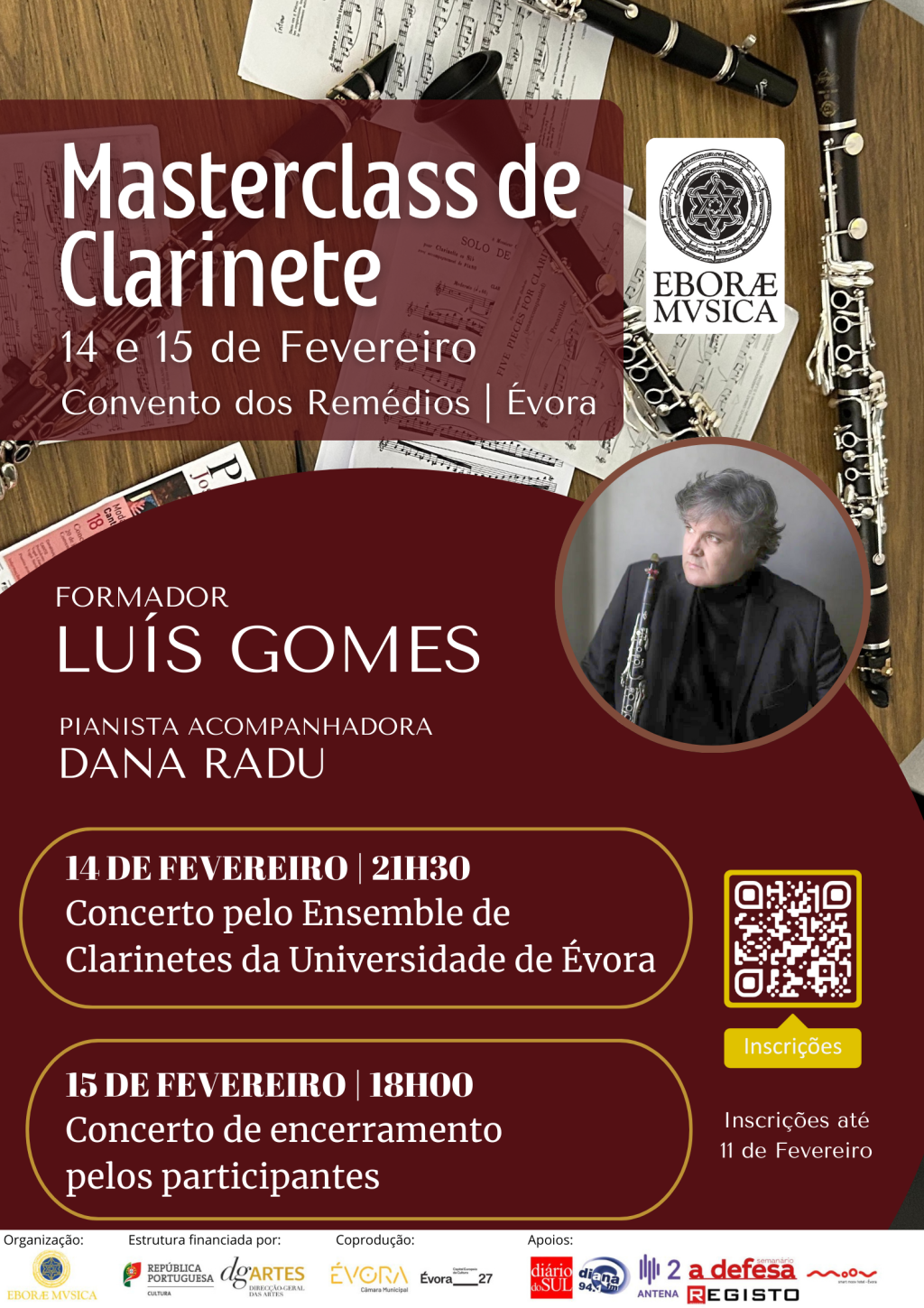 A “Eborae Mvsica”- Associação Musical de Évora informa que nos dias 14 e 15 de fevereiro, se realiza a masterclass de clarinete, orientada por Luís Gomes, no Convento dos Remédios, Av. de S. Sebastião, em Évora. No dia 14 de fevereiro haverá um concerto pelo formador Luís Gomes, acompanhado ao piano por Dana Radu, e com a participação de Mário Vinagre (professor da classe de clarinetes do Eborae Musica). A segunda parte do concerto está a cargo do Ensemble de Clarinetes da Universidade de Évora (direção de Luís Gomes). No dia 15 de fevereiro, às 18h00, haverá o tradicional concerto de encerramento pelos formandos. Estes concertos são abertos à população e de entrada livre.