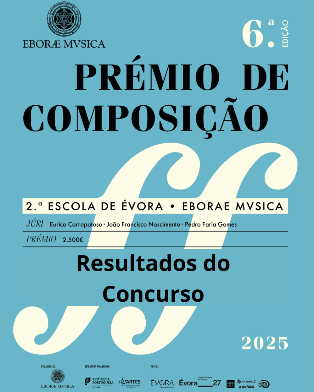 A “Eborae Mvsica”- Associação Musical de Évora promoveu a 6.ª edição do Prémio de Composição “2ª Escola de Évora | Eborae Mvsica”. O resultado do Concurso, ao qual concorreram nove obras e candidatos, foi enviado pelo Júri e foi o seguinte: